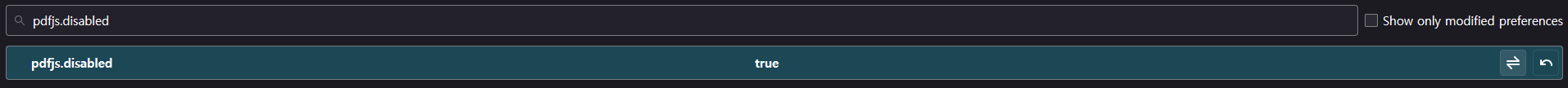이럴 경우 아래 차참고하여 config editor 연 후 pdfjs.disabled 설정을 아래와 같이 true로 변경
