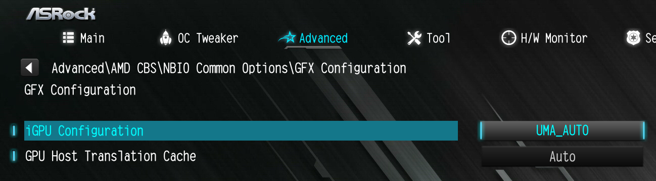 아래와 같이 iGPU 설정을 UMA_Auto로 바꾸고, 내장그래픽을 모니터 1, 외장그래픽을 모니터 2에 연결하였음