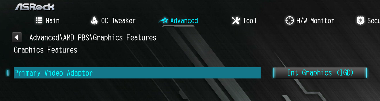 결론은 그래픽 카드의 primary 설정이 ext로 되어있는게 문제였고, Primary video adaptor를 아래와 같이 Int Graphics 로 설정하면 부팅 시 내장그래픽 카드에 연결된 모니터가 먼저 켜지고, 1660에 연결된 모니터가 켜짐