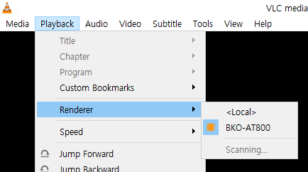 "VLC 플레이어 실행 후 아래와 같이 playback -> Renderer 선택 후 원하는 장치 선택"